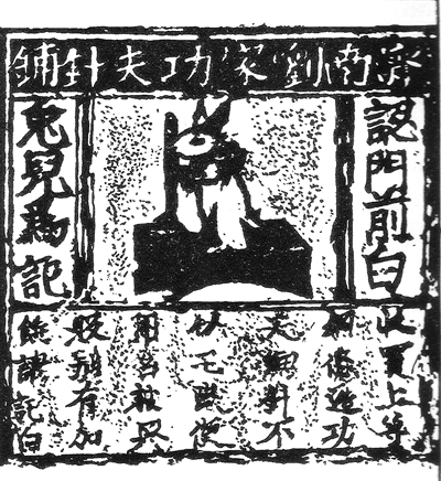 在中國國家博物館,陳列著一塊北宋年間“濟南劉家功夫針鋪”用來印刷廣告的銅雕版,其長12.4厘米,寬13.2厘米,畫面正中是一只站立搗藥的白兔,左右注明“認門前白兔兒為記”,這是在告訴買家“一定要認準本店的白兔搗藥商標進行選購”;白兔下方廣告文辭稱:“收買上等鋼條,造功夫細針,不誤宅院使用。轉賣興販,別有加饒,謂記白”,意思是說:“我們家用最好的原材料,花費功夫造針,使用方便。如果有人想批發(fā)轉買,還可以優(yōu)惠,但要告訴買者或注明是白兔牌的產品”。這件“濟南劉家功夫針鋪”銅雕版是已知世界上最早出現的商標廣告實物。宋代使用銅版印刷的廣告,既可以做產品的包裝,也可以做廣告招貼的海報或者傳單,這種紙單在宋代叫“仿單”或“裹貼”。