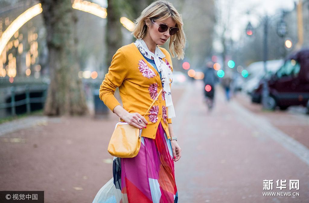 ??? 近日,德國杜塞爾多夫,時尚博主Gitta Banko街拍。她戴Miu Miu茶色墨鏡,身穿Steffen Schraut橘色亮片拼貼針織開衫,內(nèi)搭Steffen Schraut白色蝴蝶印花系帶雪紡襯衫,Steffen Schraut拼色百褶紗裙,肩背Volker Lang橘色口金包,腳踩Kurt Geiger白色尖頭高跟短靴。