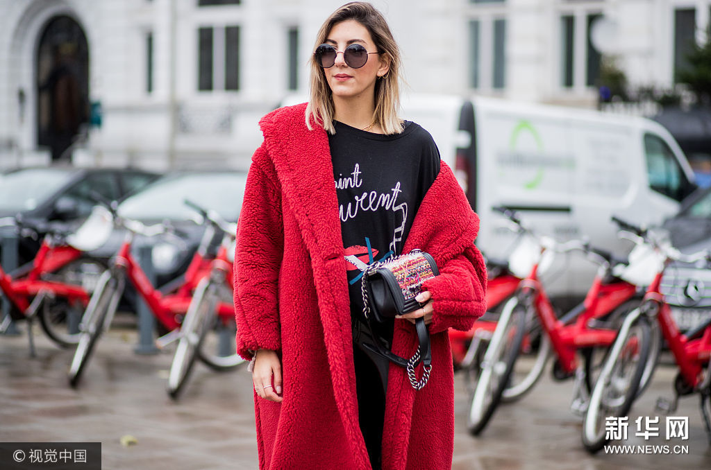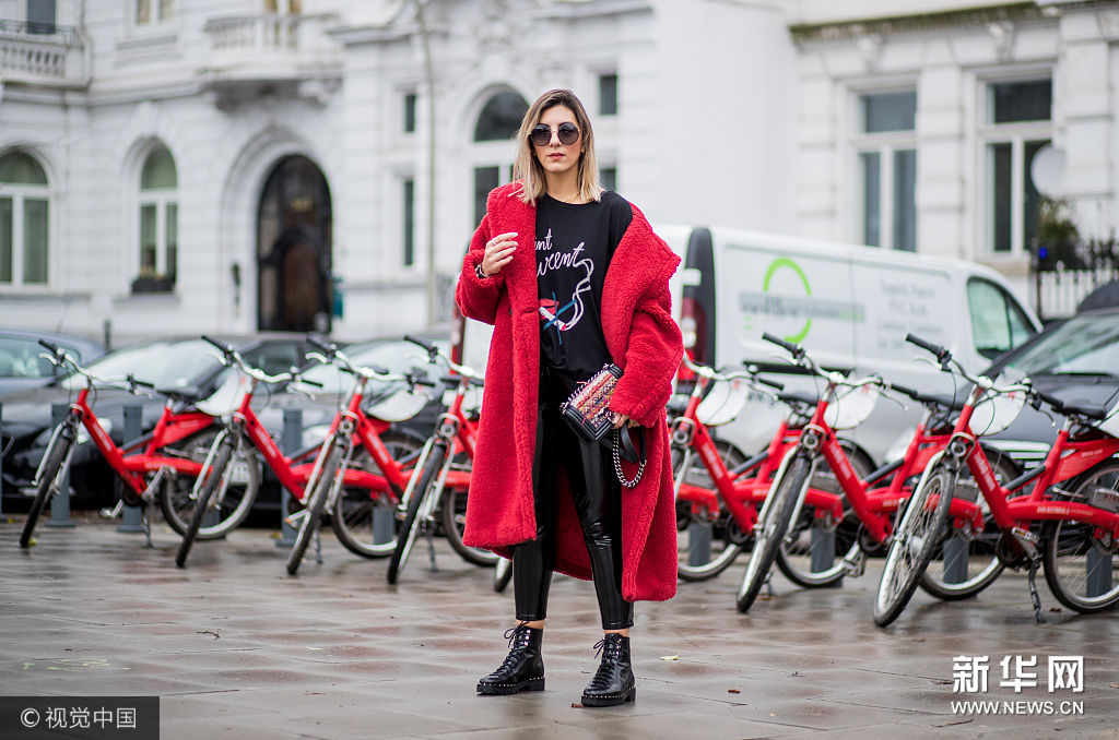 ??? 當?shù)貢r間2017年12月5日,德國漢堡,時尚博主Aylin Koenig街拍。她戴Dolce & Gabbana黑色圓框墨鏡,身穿Max Mara紅色羊羔毛大衣,內(nèi)搭Saint Laurent黑色字母紅唇印花衛(wèi)衣,手拎Chanel粗呢拼接鏈條包,下穿Asos黑色漆皮緊身皮褲,腳踩Valentino黑色金屬釘鑲嵌系帶短靴。