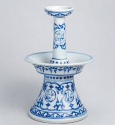 這是一件明正德年間的青花燭臺。燭臺很復雜,由四部分組成,最上端為蠟燭插口,外壁繪如意云頭紋;其下為燭臺細長支柱,中部繪圓形開光,開光內(nèi)書寫阿拉伯文,上下分別繪勾蓮花枝紋及菱形紋。再下為承托圓盤,也繪如意云頭紋;最下端為喇叭形臺座,也繪圓形開光,開光內(nèi)書寫阿拉伯文,開光上下分別繪勾蓮花枝紋及菱形紋。燭臺上的阿拉伯文與傳統(tǒng)紋飾,表現(xiàn)出阿拉伯文化與中華傳統(tǒng)文化的交融。