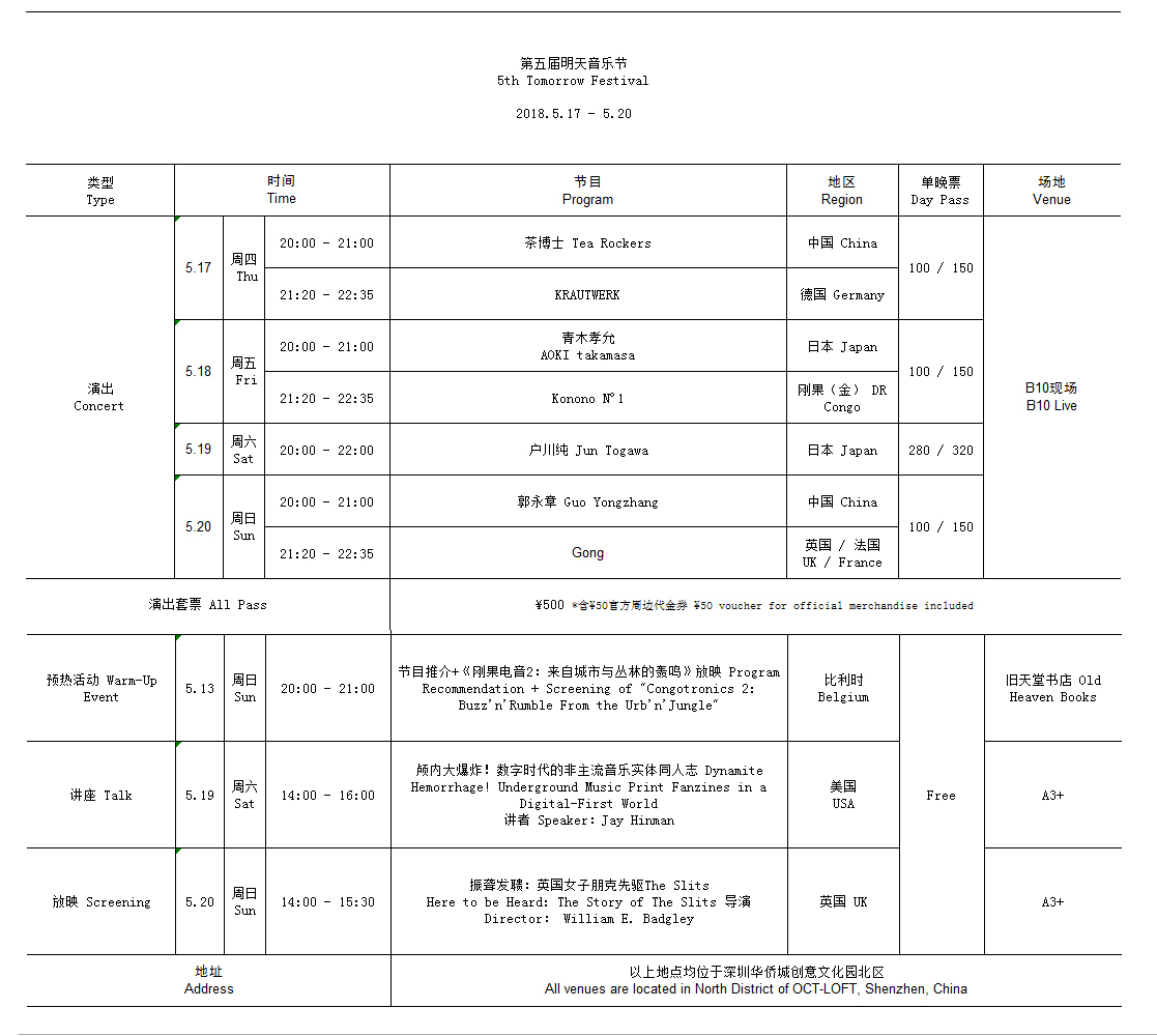 深圳新聞網(wǎng)訊 五月既至,好事即將發(fā)生。由深圳華僑城創(chuàng)意文化園主辦的第五屆明天音樂節(jié)將于2018年5月17日至20日在B10現(xiàn)場舉行。本屆明天音樂節(jié)作為“有形無界”華僑城創(chuàng)意文化園文博會分會場系列活動的重點項目,將邀請來自6個國家的7組音樂家/藝術家,呈現(xiàn)包括演出、講座、紀錄片放映在內(nèi)的多元節(jié)目。除此之外,策展人將于5月13日在舊天堂書店做節(jié)前預熱,屆時會有節(jié)目介紹環(huán)節(jié)和一場完整的放映活動。