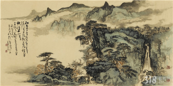 范陽先生的山水畫,筆法近取傅抱石、黃秋園,遠溯“元四家”中黃公望、王蒙。筑居楊岐山下,使先生日夜親近自然山水,吐納天地,養(yǎng)浩然之氣?!巴鈳熢旎?,中得心源”,唐代張璪一言道破了山水畫家修養(yǎng)、悟性的不二法門。范陽先生正是以自然(造化)為營養(yǎng),入而為心靈化育,镕冶成亦古亦新,遠離塵俗的獨特風格。近作《松風泉聲》(五屏聯(lián))氣勢磅礴,大開大合,細究又十分謹嚴。筆墨與丘壑融為一體,既豪放又穩(wěn)健。淺絳青綠的設(shè)色,使畫面有蔥翠欲滴之感??胺Q山水畫中的經(jīng)典。