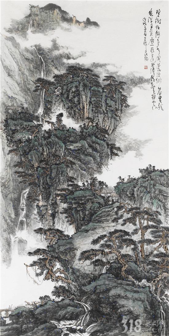 我以為,范陽先生是真正在心性上貼近古人“不下堂筵,坐窮泉壑”,其現(xiàn)居贛中名岳武功山、楊岐山之中。尤其武功山,史上與衡山、廬山并稱江南三大名山,被冠以“衡首廬尾武功中”,山脈綿延浩瀚,茫茫無際。范陽先生終日面山臨壑,弄筆自適,得武功真容。山水畫從來就不是簡單的描摹自然的風光,無論丘園養(yǎng)素還是泉石嘯傲,都是畫者精神的自然流露,這是畫家筆墨情態(tài)的表達,亦是畫家藝術(shù)境界追求的體現(xiàn)。對于山林的描繪,承載了畫者對泉石意趣的向往,對于林下境界的追求。范陽先生的山水畫作品長于布景,對山中的“陰、晴、朝、夕”的細膩描繪都有他自已獨特感悟和表達。筆下極丘壑浩渺之勢,奇峰羅列,宛有風骨,深壑幽谷,其勢超峻;至于松柏掩映,峭壁涌泉,野道幽麓,于野逸之態(tài)甚備。范陽先生數(shù)十年來遍臨南北宗諸家,遠溯元人四家,清初四王,近至黃秋園,上下求索,崇穆有加,最終歸皈真逸正脈。新近年逾七十之作,日漸精熟,蒼腴古厚,更趨融古化古之態(tài),細究其筆下蹤跡:子久?麓臺?秋園?各不相肖,而莫不精備。諦觀其中景象:匡廬?武功?羅霄?渾然而化,不一而足。如此境地當稱“妙解”。