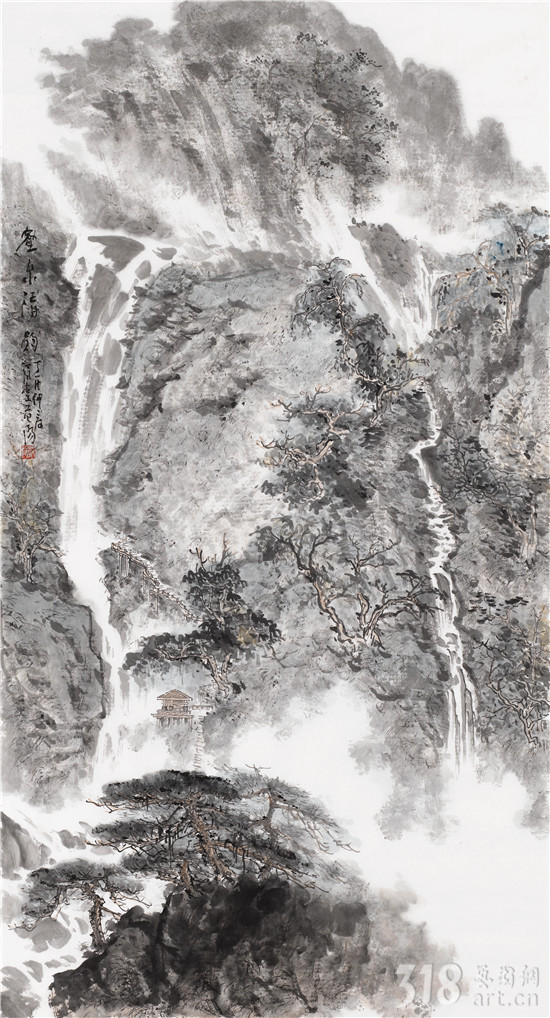 山水之所以成為中國繪畫的永恒主題,跨越時空,也在于“自然”這一永恒主題是人類心中的凈土。與卡拉揚所說的以巴赫音樂“校正視聽”同出一轍,山水藝術(shù)家籍借山水畫,作為修煉自我的一條途徑。與音樂一樣,山水畫既有抽理的邏輯,又有造化的邏輯。師造化能有溫度,抽理能讓我們的心靈得到升華與純凈,我們的手、眼、心在師造化和抽理中,最后達到師物游心、物我兩忘之境。范陽先生終年隱居江西武功山和楊岐山,師造化使他筆下的丘壑、林泉、松石,高曠而有真意,不落程式窠臼。早年潛心古法研究,謙遜問學,轉(zhuǎn)益多師。門庭既闊,筆墨則不得不精,眼界既寬,格調(diào)則不得不高。近年的作品,更從早年的細膩綿密,化而為奔放渾厚。其畫不論大作或小品,首取氣韻,不營營于一草一木,放逸中卻又能見綿密細致。又以草情筆法入畫,于平直處流露其錚錚骨骼及磊磊性情,飛動處可見其心瀾翻動,觀其作,可想見其作畫時心手雙暢之態(tài),如汩汩之泉,一瀉千里而不得止,非長年積養(yǎng)之功不可得哉。
