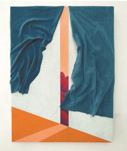 另一方面,青年藝術(shù)家們的創(chuàng)作又明顯與深圳這個急劇擴張的城市都市化景象發(fā)生了疊合。比如林海東的《紅山》,運用布面油畫與真實的絨布營造了一道門縫外的風(fēng)景,暗紅的土地帶著一束光似乎就是它本身的倒影;江安使用極簡的方式,彎曲的鐵條、折疊的木板、簡單的霓虹燈便組成了他的《木門》;武學(xué)斌將無數(shù)由遠及近的立方體組成了他的《城市》,矛盾的空間、散亂的信息以及兩側(cè)高聳的堅墻述說了置身于城市之中人的壓力。