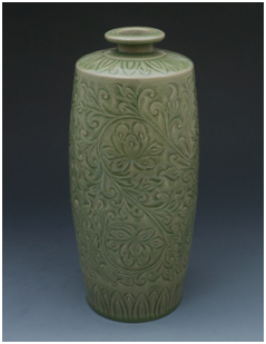 《耀瓷刻花牡丹紋罐》造型飽滿渾圓,而靈秀活潑,敦厚端莊。鼓腹處的纏枝牡丹富貴雍容,刻花刀鋒犀利,線條流暢。滿施的青釉冰潔玉潤,超凡脫俗。