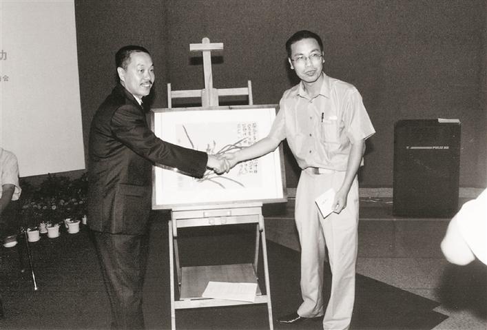 2005年7月,陳湘波(左)出席“情系災(zāi)區(qū)奉獻(xiàn)愛心——深圳市文化系統(tǒng)書畫作品賑災(zāi)義賣活動(dòng)”。