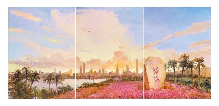 在創(chuàng)作中,文禎非用了現(xiàn)實(shí)的元素,前海標(biāo)志性石碑,棕櫚樹代表著南方特征,前海距離寶安機(jī)場很近,天空中的深航飛機(jī)象征著深圳開放的胸懷,遠(yuǎn)處平安大廈等標(biāo)志性現(xiàn)代化建筑一字排開,地面是深圳市花簕杜鵑……“這些都是深圳人熟悉的現(xiàn)實(shí)素材,在畫面展現(xiàn)時(shí)更多地把對深圳未來發(fā)展的憧憬和信心放入了畫面,調(diào)整了前海石碑與建筑的視覺關(guān)系,地面一片簕杜鵑是深圳創(chuàng)業(yè)初期英雄主義激情的象征,更代表著新時(shí)期深圳創(chuàng)新創(chuàng)造的活力與熱情;現(xiàn)代建筑的背景也預(yù)示著深圳40年來的成就也為前海發(fā)展提供了堅(jiān)實(shí)基礎(chǔ);早晨天空中朝霞放射狀的光芒萬丈,表達(dá)了對未來的憧憬……”文禎非滔滔不絕中透露出創(chuàng)作時(shí)的激情。