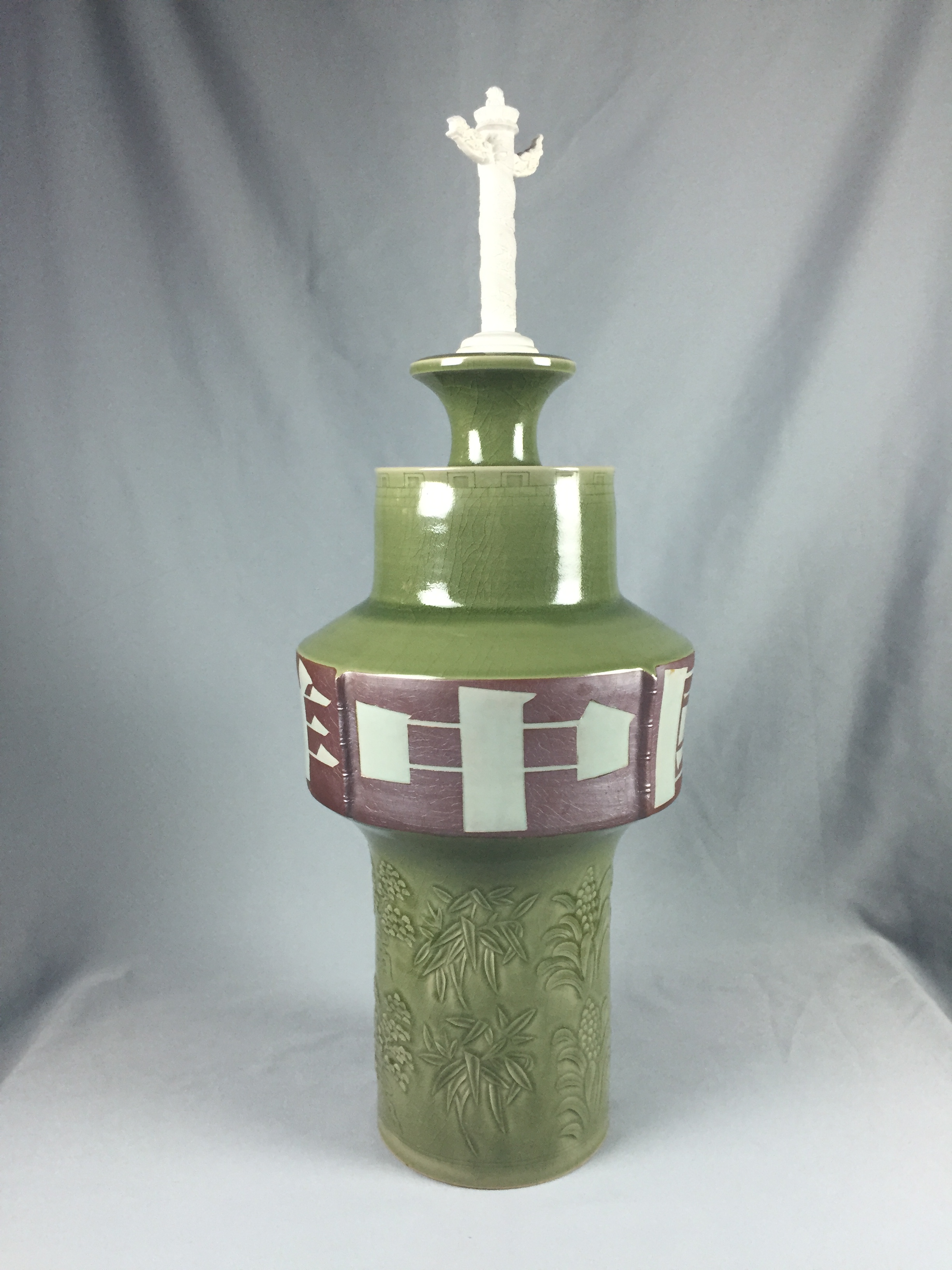 此次參與展出的青瓷作品中,一件名為“紅底玉縷耀瓷刻花松竹萬年青紋中國吉祥”的青瓷作品人氣頗高。據(jù)介紹,此件作品由中國工藝美術(shù)大師孟樹鋒親自制作。作品整體呈現(xiàn)“中”字造型,偉岸挺拔,雄渾方正,險峻奇特而大氣磅礴。瓶頂一尊華表,白泥素胎,一如漢白玉石雕。瓶肩梢高凸又微微外撇,是一圈五十六個垛峰與垛口的萬里長城,代表著中國五十六個民族團(tuán)結(jié)一心。其下碩腹,則使用耀州紅底玉縷的工藝書寫“中國吉祥”四個雕版大字,點(diǎn)明作品主題。下部立柱上刻、劃、貼花的萬年青、青松、竹子,體現(xiàn)耀州瓷的風(fēng)格并以此祝福祖國。