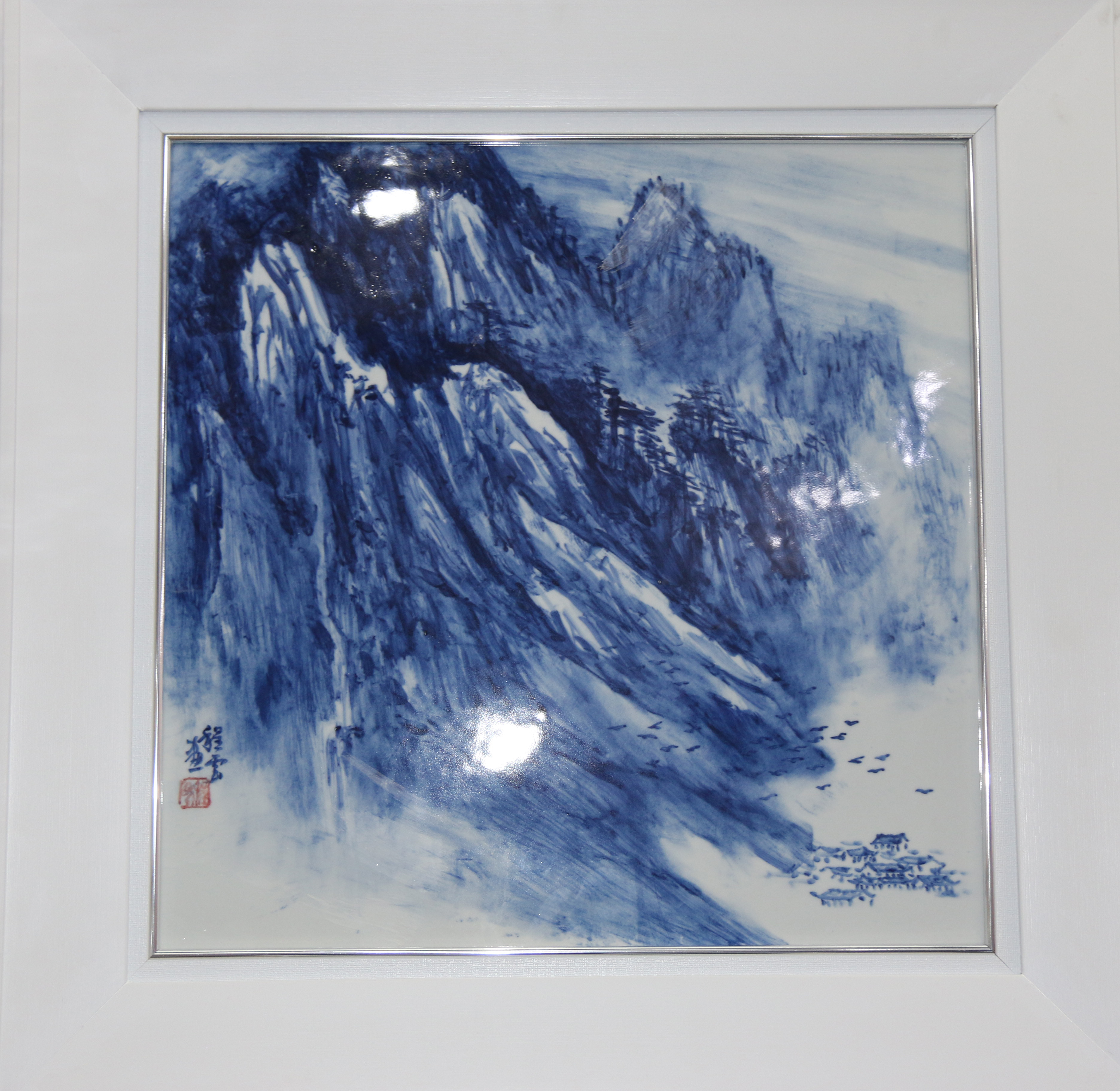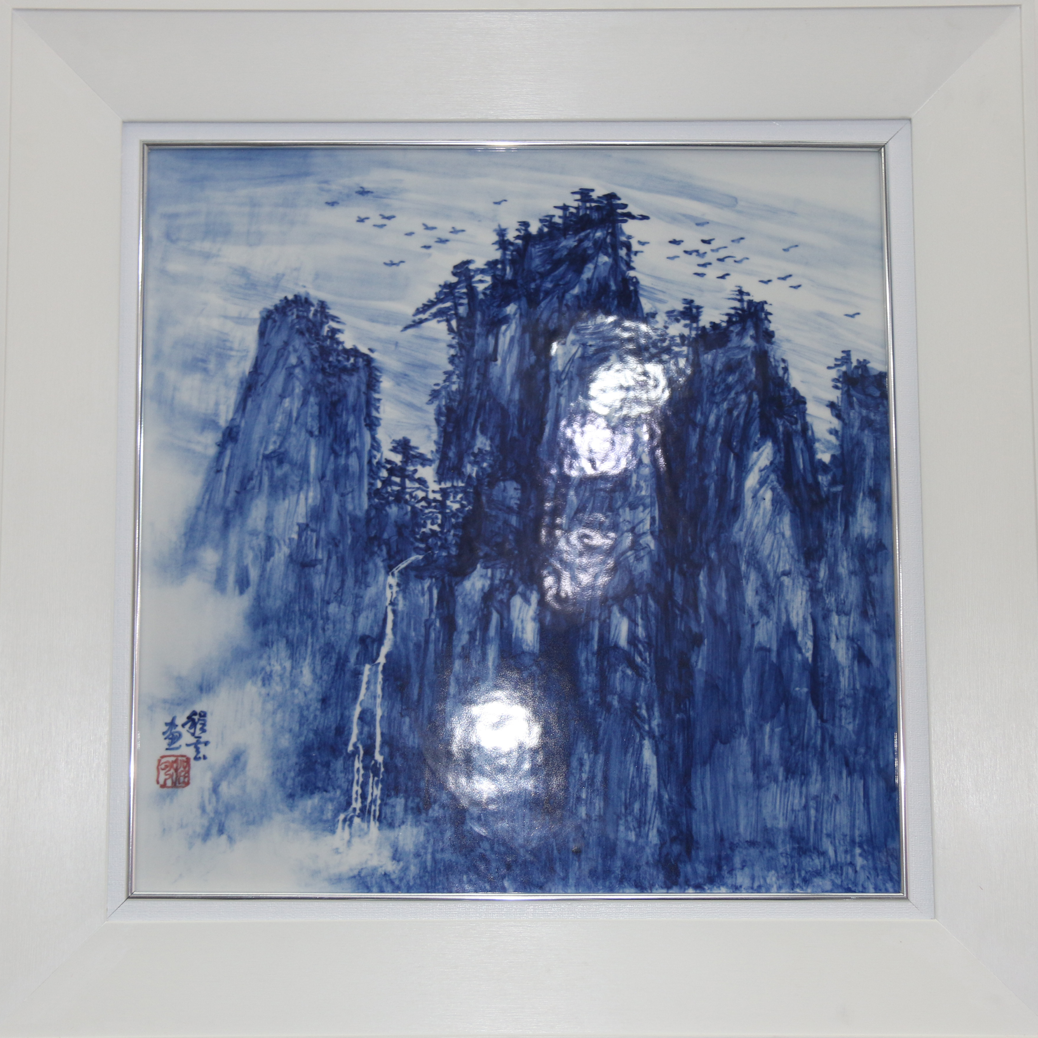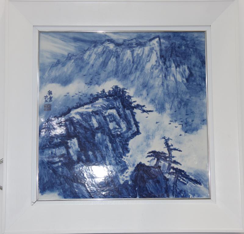 傳統(tǒng)的青花瓷板畫運用天然鈷料在白泥上進行繪畫裝飾,再罩以透明釉,然后在高溫1300攝氏度上下一次燒成,使色料充分滲透于坯釉之中,呈現(xiàn)青翠欲滴的藍色花紋,顯得幽倩美觀,明凈素雅。