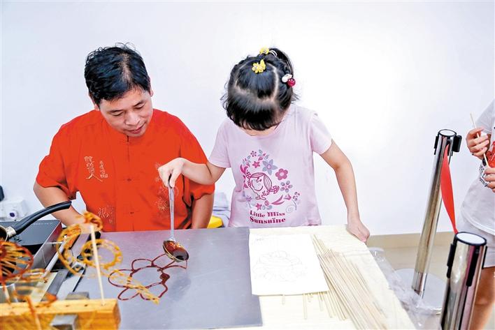 系列活動(dòng)中最受小朋友歡迎的還要屬糖畫了。糖畫是一種傳統(tǒng)民間手工藝,以糖為材料來作造型的。所用的工具僅一勺一鏟,糖料一般是紅、白糖加上少許飴糖放在爐子上用溫火熬制,熬到可以牽絲時(shí)即可用來澆鑄造型了。陪伴小朋友們的家長表示,孩子親自動(dòng)手制作,既能加深對(duì)民間藝術(shù)的認(rèn)識(shí)和濃厚興趣,又能增強(qiáng)動(dòng)手能力,十分有意義。而小朋友們則認(rèn)為,不光可以學(xué),還可以吃,真好。