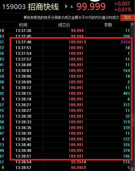 根據(jù)Wind數(shù)據(jù)顯示,招商快線(xiàn)13日的開(kāi)盤(pán)價(jià)格為99.991,此后一直在99.990—99.995之間波動(dòng),但到13:37:48突然出現(xiàn)了2434手的大單,成交價(jià)格為109.991,在一分鐘左右的時(shí)間,同一價(jià)格上又陸續(xù)出現(xiàn)了20筆成交,隨后價(jià)格恢復(fù)到99.994。