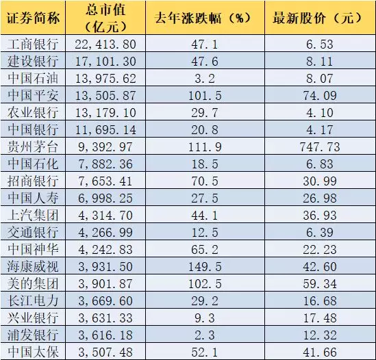 據(jù)匯大數(shù)據(jù)終端統(tǒng)計,截止到今年3月20日,中國平安的市值為1.35萬億,僅次于工商銀行、建設(shè)銀行和中國石油。在市值排名前20名的公司中,去年全年股價漲幅在100%以上的公司僅有4家,分別是??低?、貴州茅臺、美的集團(tuán)和中國平安,漲幅分別為149.5%,111.9%、102.5%和101.5%。