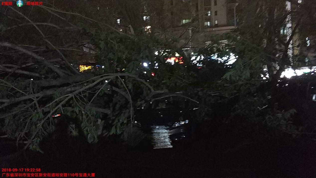 坐標(biāo)寶安,17日晚,95589接到客戶報(bào)案車輛被大樹(shù)壓砸,接到報(bào)案后查勘員3分鐘內(nèi)聯(lián)系客戶,指引理賠手續(xù)。15分鐘內(nèi)到達(dá)現(xiàn)場(chǎng)。指引客戶到太平財(cái)險(xiǎn)合作車行進(jìn)行維修。
