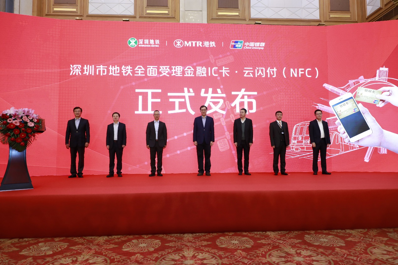 3月1日上午,五洲賓館內舉行了“深圳市地鐵金融IC卡過閘服務”的啟動儀式。中國人民銀行副行長范一飛、深圳市人民政府副市長艾學峰、招商銀行總行副行長劉建軍、中國銀聯董事長邵伏軍、招商銀行深圳分行行長岳鷹、深圳地鐵董事長辛杰、港鐵(深圳)總經理黃琨暐等相關領導出席了啟動儀式,并共同點亮LED燈幕,宣告深圳市地鐵8條線路的所有車站正式啟用過閘功能。