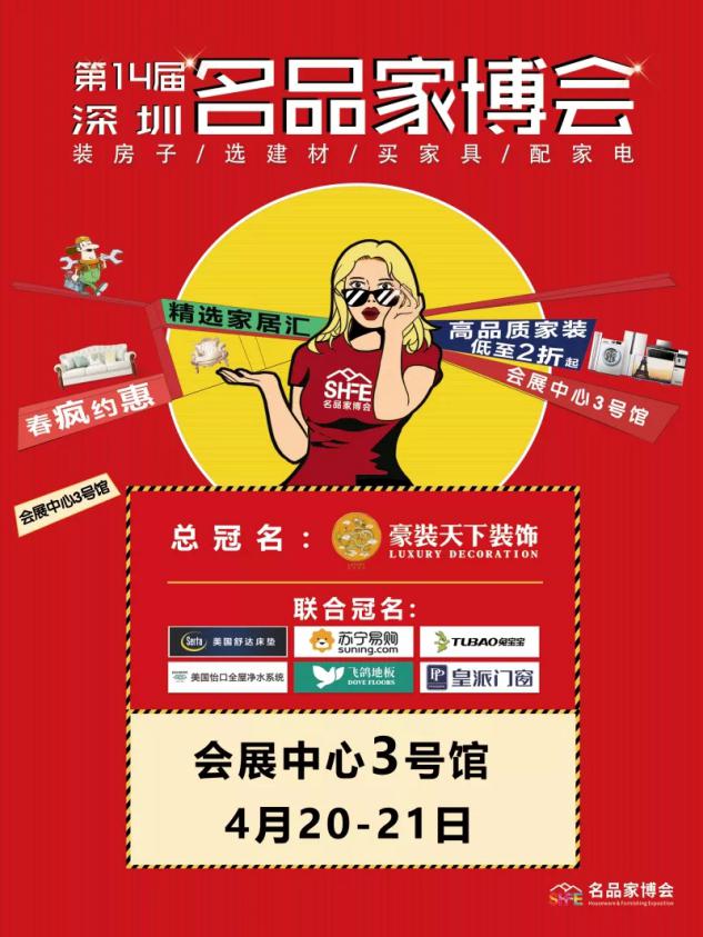 由豪裝天下裝飾集團(tuán)總冠名并聯(lián)合蘇寧易購(gòu)、美國(guó)舒達(dá)床墊、飛鴿地板、皇派門窗共同助力的第14屆深圳名品家博會(huì),將于4月20日—21日舉行在深圳會(huì)展中心舉辦。千余個(gè)家居一線品牌、萬余款家裝大牌產(chǎn)品齊聚本屆深圳家博會(huì),將為深圳數(shù)萬裝修家庭帶來驚喜與福利。