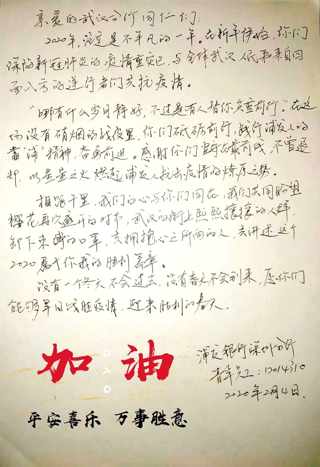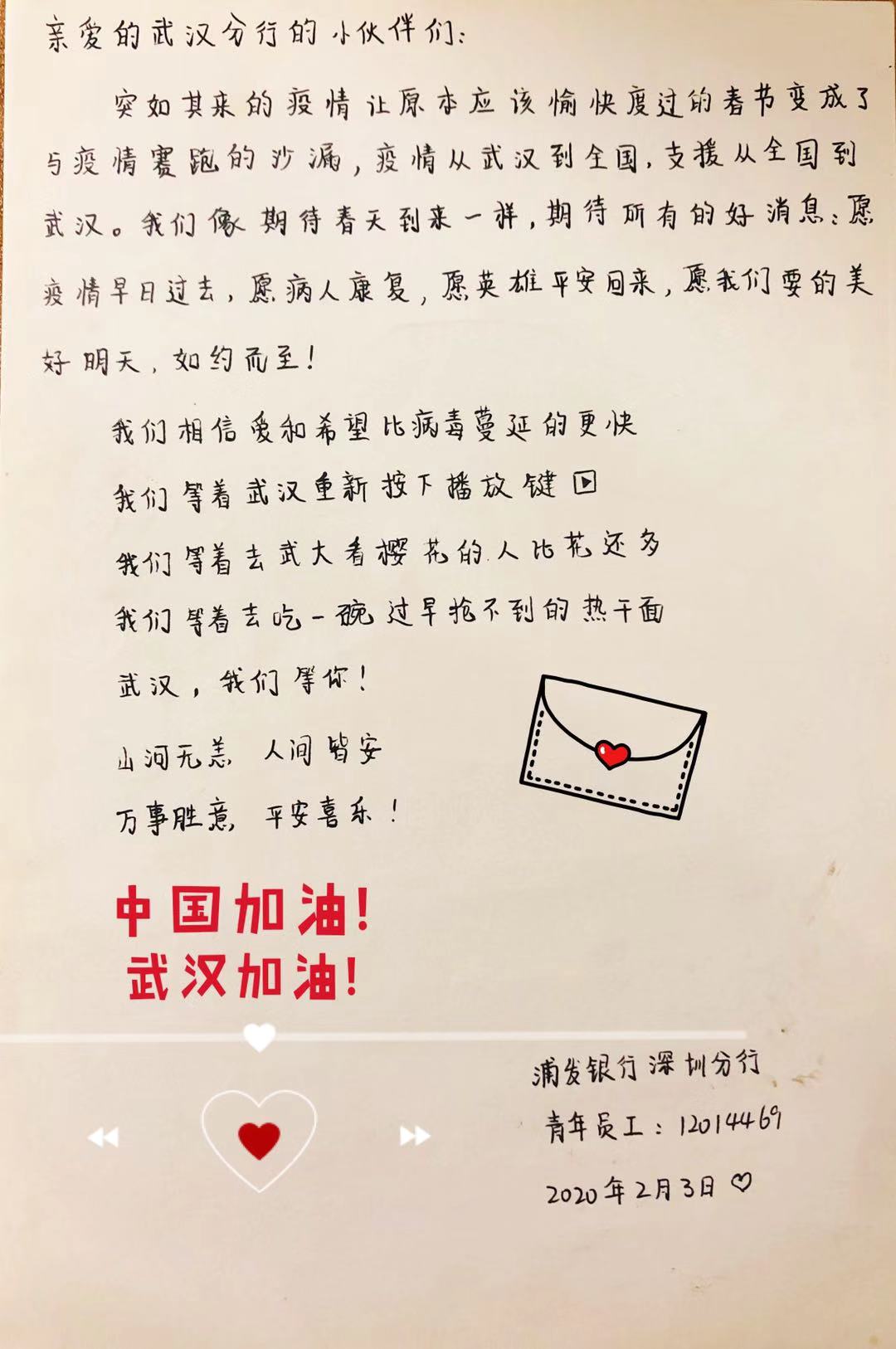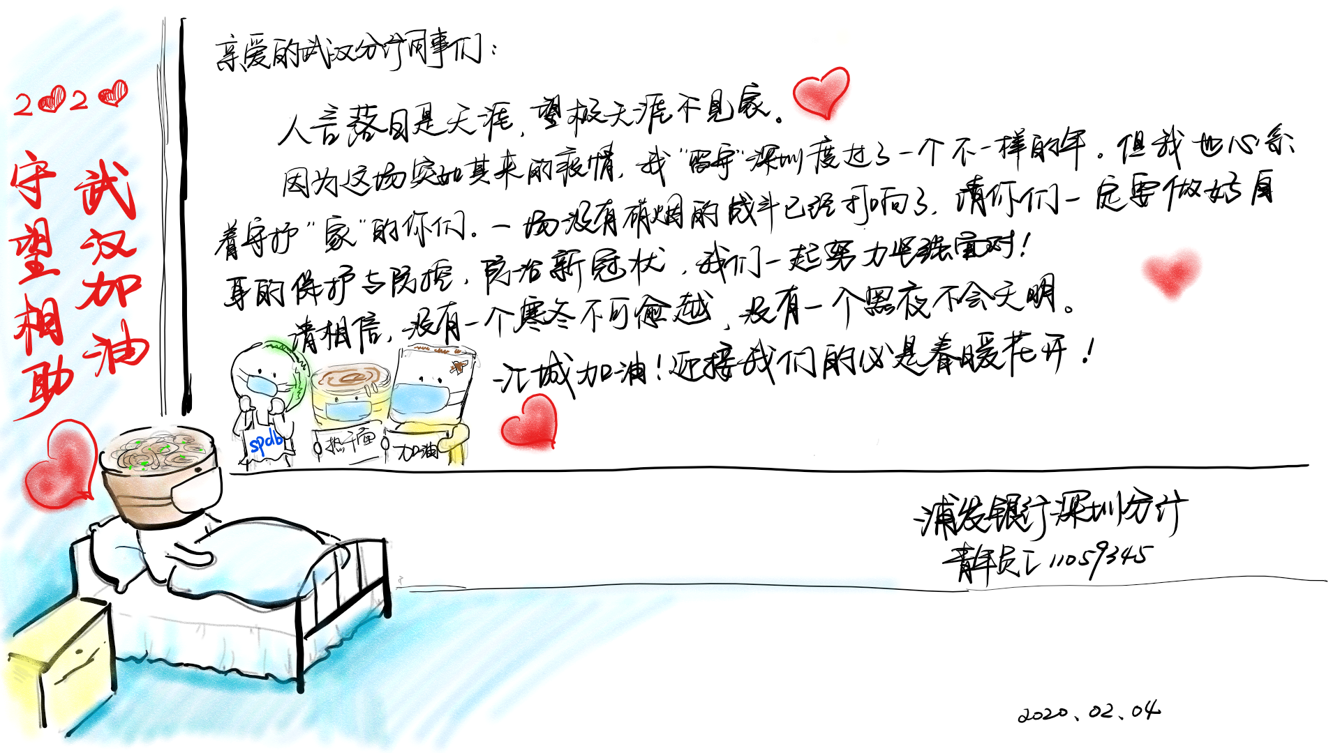 2月3日,浦發(fā)銀行深圳分行團(tuán)委向全體青年員工發(fā)出了一封倡議書。在倡議書中,該行團(tuán)委號(hào)召?gòu)V大團(tuán)干部、團(tuán)員青年立即行動(dòng),充分發(fā)揮黨的助手和后備軍作用,展現(xiàn)青年突擊隊(duì)作為,為堅(jiān)決打贏疫情防控阻擊戰(zhàn)貢獻(xiàn)力量,并向青年提出三個(gè)要求:“堅(jiān)定信心不迷茫,聽黨指揮勇?lián)?dāng)”、“科學(xué)防范不信謠,眾志成城控疫情”、“居家辦公不離崗,服從指揮勇?lián)?dāng)”。當(dāng)日,浦發(fā)銀行深圳分行發(fā)起了給武漢分行同事寄送家書的活動(dòng),該行全體青年手寫家書,圖文并茂、紙短情長(zhǎng),表達(dá)了對(duì)疫區(qū)“戰(zhàn)友們”最深切的關(guān)愛和鼓勵(lì),身體力行做好他們堅(jiān)強(qiáng)的后盾。
