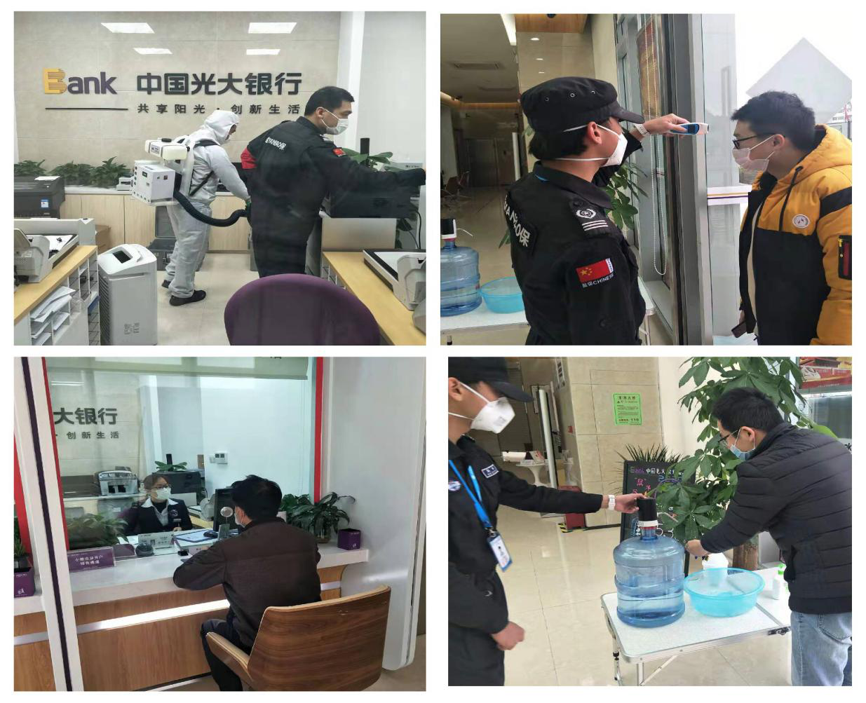 物資保障是防疫工作基礎(chǔ)性工作。復(fù)工之前,支行領(lǐng)導(dǎo)帶隊(duì)落實(shí)復(fù)工所需各項(xiàng)物資準(zhǔn)備情況,指定專人每天對網(wǎng)點(diǎn)進(jìn)行清潔與消毒,在所有客戶會觸摸到的公共區(qū)域貼上保鮮膜,每日三次消毒更換。要求全體上崗人員佩戴口罩、手套,做好自身防護(hù)。同時,支行根據(jù)自身?xiàng)l件,在門口設(shè)置流動水、洗手液、消毒液、紙巾、口罩回收簍等,在客戶進(jìn)入網(wǎng)點(diǎn)時,要求必須佩戴口罩、測量體溫、進(jìn)行洗手登記,切實(shí)做好客戶安全防護(hù)。