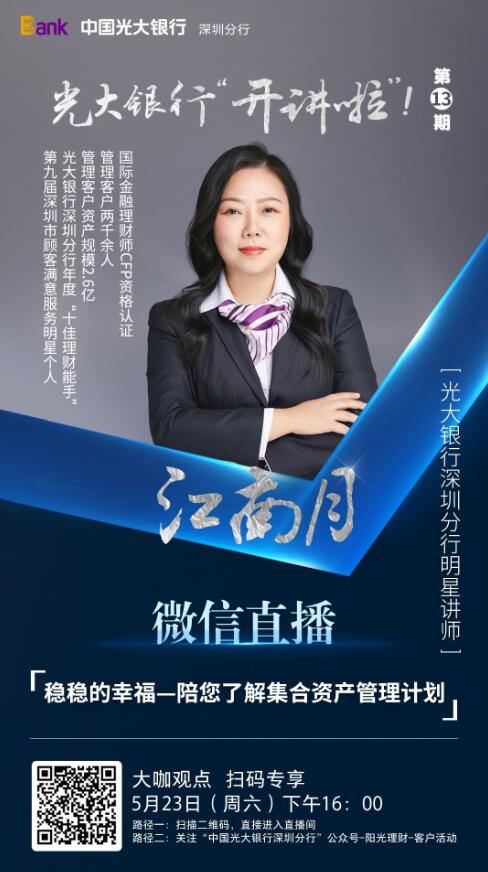 此次,光大銀行深圳分行攜手《深圳晚報(bào)》邀請(qǐng)CFP資格認(rèn)證國(guó)際金融理財(cái)師、該行年度“十佳理財(cái)能手”、明星講師江南月帶來《穩(wěn)穩(wěn)的幸?!隳私饧腺Y產(chǎn)管理計(jì)劃》主題分享,幫助更多客戶深入了解并購買集合資產(chǎn)管理計(jì)劃產(chǎn)品。講師江南月將從集合資產(chǎn)管理計(jì)劃的基本概念和產(chǎn)品優(yōu)勢(shì)出發(fā),深入淺出,讓更多客戶了解集合資產(chǎn)管理計(jì)劃產(chǎn)品,并幫助客戶選擇購買這類產(chǎn)品。該行代銷的純債類集合資產(chǎn)管理計(jì)劃一直以來都以穩(wěn)健著稱,目前已到期產(chǎn)品全部達(dá)到了業(yè)績(jī)比較基準(zhǔn),設(shè)置超額收益的產(chǎn)品也都為客戶實(shí)現(xiàn)了超額回報(bào)。