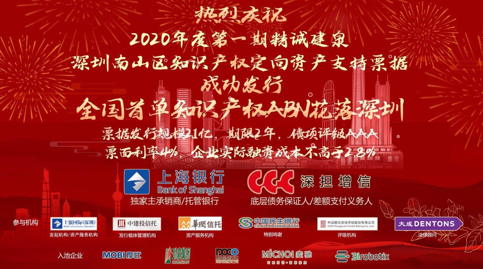 深圳新聞網(wǎng)·見圳客戶端2020年9月23日訊 昨日,隨著上海銀行股份有限公司主承的“上銀國際投資(深圳)有限公司2020年度第一期精誠建泉深圳南山區(qū)知識產(chǎn)權(quán)定向資產(chǎn)支持票據(jù)”成功發(fā)行,中國銀行間交易商協(xié)會首單民營科技中小企業(yè)專項知識產(chǎn)權(quán)ABN項目花落深圳。該項目不僅是對知識產(chǎn)權(quán)證券化的一次創(chuàng)新和實踐,也為中小民營科技企業(yè)開辟了一條在銀行間市場融資的新渠道。本期ABN共五家入池企業(yè),發(fā)行規(guī)模2.1億元,期限兩年,票面4%,經(jīng)南山區(qū)政府補貼和深圳擔保集團費用減免,入池企業(yè)實際融資成本低于年化2.80%。 一直以來,上海銀行以“精誠至上,信義立行”為核心價值觀,堅持“融智”與“融資”有機結(jié)合,以實體經(jīng)濟需求為導向,不斷推進產(chǎn)品創(chuàng)新,持續(xù)為實體經(jīng)濟發(fā)展提供更高質(zhì)量、更有效率的金融服務(wù)。此次首單知識產(chǎn)權(quán)ABN項目花落深圳,不僅是深圳不斷強化金融創(chuàng)新所取得的重要成果,更是上海銀行探索服務(wù)深圳、服務(wù)實體經(jīng)濟新模式的重要實踐。