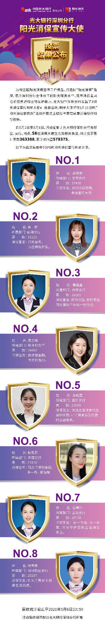深圳新聞網·見圳客戶端2021年5月8日訊 昨日,光大銀行深圳分行“陽光消保宣傳明星大使”線上投票圓滿結束,從58名宣傳大使中投票產生了賴春妮、肖雨、曹晶晶、周之靖、黃曉霞、蔣易萱、曾粵玲、林思思8名陽光消保宣傳明星大使。明星大使將在5月15日的“陽光消保健康跑”活動開幕式上被授予榮譽勛章并接受行領導授旗。5月1日,光大銀行深圳分行發(fā)起了“陽光消保宣傳明星大使”線上投票,旨在樹立起陽光消保宣傳工作典型,打造“陽光消保”品牌,提升深圳分行全體員工的陽光服務水平,提高消費者風險防范意識和自我保護能力,提升光大在深圳地區(qū)的品牌影響力。投票活動得到社會熱烈響應,據(jù)統(tǒng)計,此次累計票數(shù)達363388次。