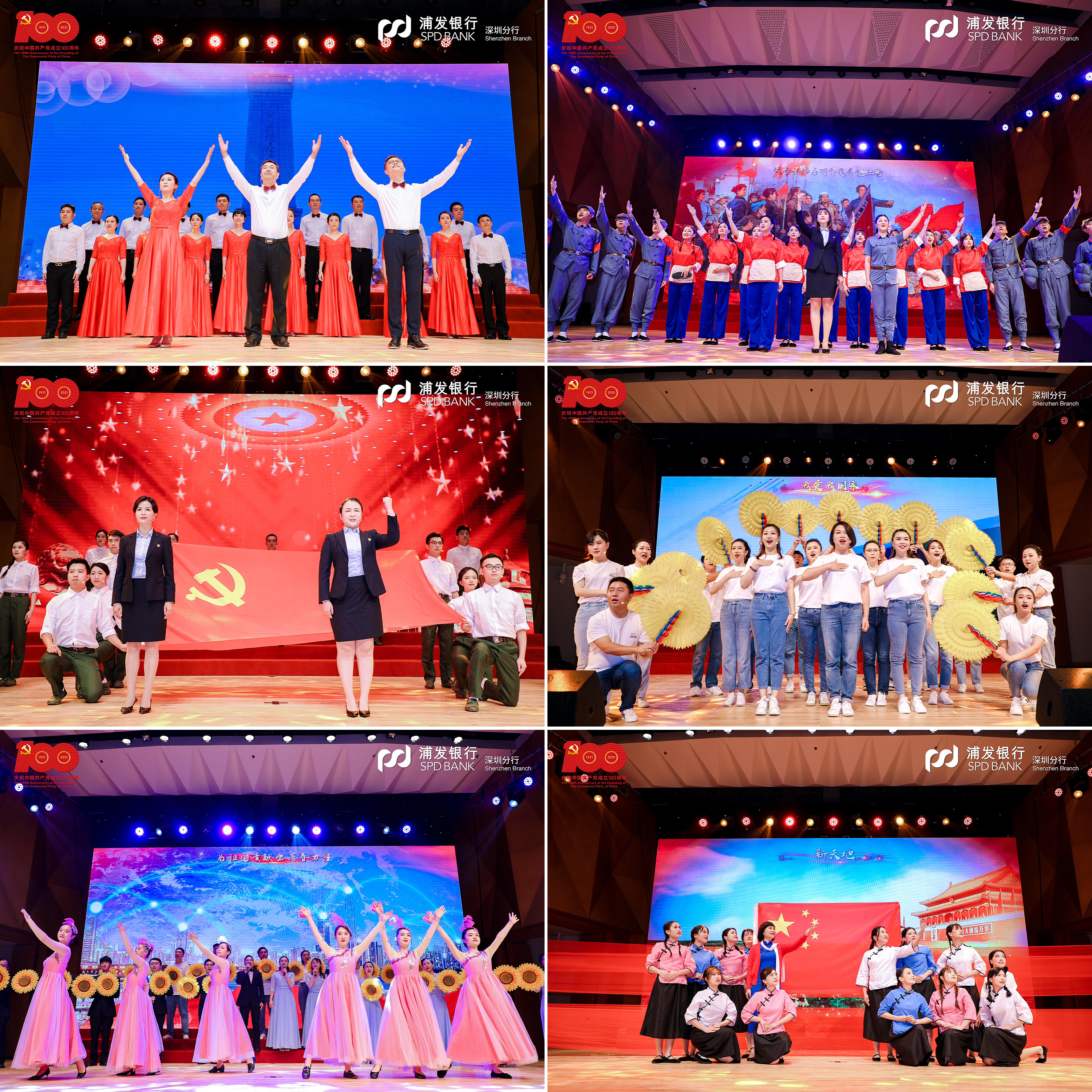 在黨支部風(fēng)采展示環(huán)節(jié),該行基層黨支部精心編排12首紅色經(jīng)典,通過(guò)4個(gè)篇章再現(xiàn)百年波瀾壯闊的偉大歷程。第一篇章“開(kāi)天辟地”演繹了中國(guó)共產(chǎn)黨在新民民主義革命時(shí)期完成救國(guó)大業(yè)的輝煌歷程,《保衛(wèi)黃河》吹響了高亢嘹亮的愛(ài)國(guó)號(hào)角,《十送紅軍》深情演繹血濃于水軍民情,《繡紅旗》一腔熱血帶著大家重回歌樂(lè)山。第二篇章“改天換地”回顧了中國(guó)共產(chǎn)黨在社會(huì)主義革命和建設(shè)時(shí)期完成興國(guó)大業(yè)的奮斗史詩(shī),《歌唱祖國(guó)》撥動(dòng)人們最難忘的記憶,《我們走在大路上》展現(xiàn)當(dāng)年敢闖敢拼的奮進(jìn)之姿態(tài),《唱支山歌給黨聽(tīng)》唱出人民心中永恒的贊歌。第三篇章“翻天覆地”再現(xiàn)了中國(guó)共產(chǎn)黨在改革開(kāi)放和社會(huì)主義現(xiàn)代化建設(shè)新時(shí)期推進(jìn)富國(guó)大業(yè)的光榮壯舉,《在燦爛陽(yáng)光下》重現(xiàn)春風(fēng)化雨之后的奮斗時(shí)光,《國(guó)家》打動(dòng)多少人的赤子之心,《我們的生活充滿陽(yáng)光》訴說(shuō)了改革開(kāi)放背后的喜悅。第四篇章“驚天動(dòng)地”展現(xiàn)了中國(guó)共產(chǎn)黨在中國(guó)特色社會(huì)主義新時(shí)代推進(jìn)并將在本世紀(jì)中葉實(shí)現(xiàn)強(qiáng)國(guó)大業(yè)的偉大時(shí)代,一首《天耀中華》是浦發(fā)人最深沉的表達(dá),《燈火里的中國(guó)》讓人漫步燈火漫卷的萬(wàn)里山河,《再一次出發(fā)》展示浦發(fā)追夢(mèng)者的雄姿英發(fā)。走過(guò)“百年風(fēng)雨”,浦發(fā)銀行深圳分行合唱團(tuán)一首《我和我的祖國(guó)》,蓬勃朝氣盡顯拳拳愛(ài)國(guó)心、濃濃赤子情。篇章結(jié)束,大家全體起立,高聲合唱《沒(méi)有共產(chǎn)黨就沒(méi)有新中國(guó)》,以最真摯最熱烈的歌聲獻(xiàn)禮建黨百年。