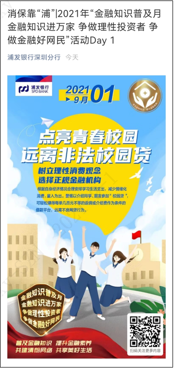 9月1日,也是校園開學(xué)的日子。開學(xué)的第一天,浦發(fā)銀行深圳分行特別推出“點亮青春校園遠(yuǎn)離非法校園貸”日歷宣傳海報,并在官方微信公眾號進行轉(zhuǎn)發(fā)宣傳,同時在46家網(wǎng)點營業(yè)大廳顯示屏播放,重點傳播校園貸金融知識,提醒學(xué)生人群,合理消費,遠(yuǎn)離不良網(wǎng)貸行為。據(jù)悉,該行將在九月每個工作日持續(xù)發(fā)布消保宣傳日歷,常態(tài)化長效推進金融知識普及月宣傳活動的開展。