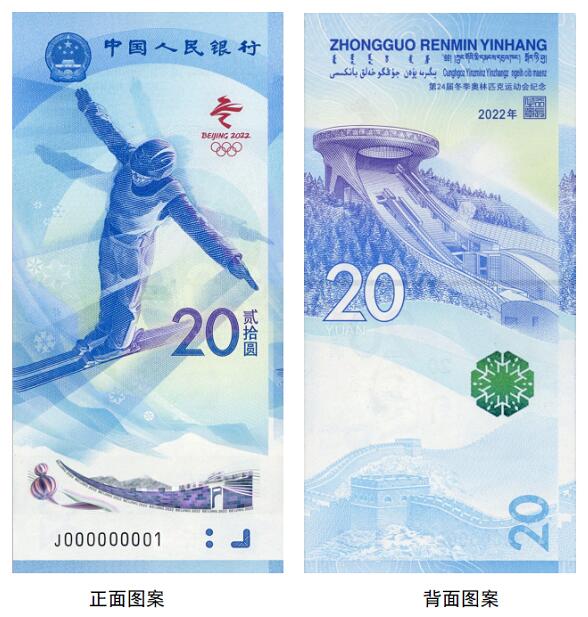 正面圖案:正面主景為自由式滑雪運(yùn)動(dòng)員圖案,上方為中華人民共和國(guó)國(guó)徽、“中國(guó)人民銀行”行名,右側(cè)為第24屆冬季奧林匹克運(yùn)動(dòng)會(huì)會(huì)徽、面額數(shù)字“20”與漢字“貳拾圓”,下方為動(dòng)感全息圖案、盲文面額標(biāo)記和冠字號(hào)碼。