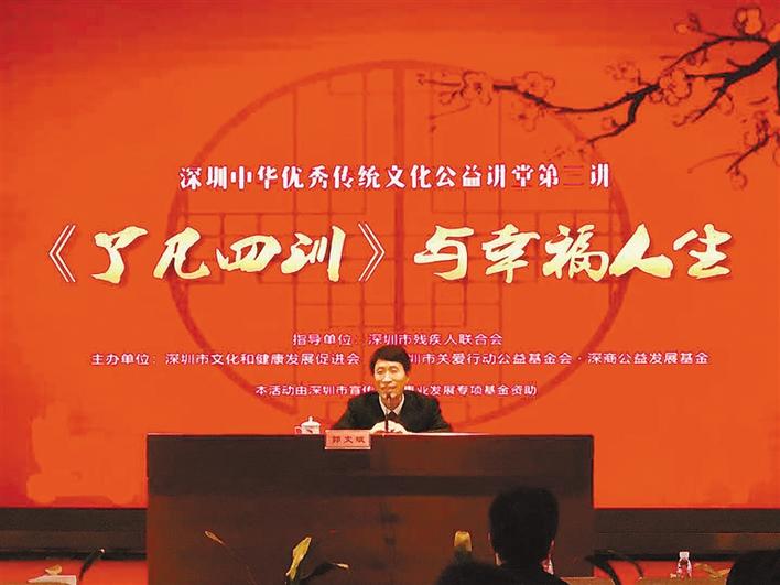 深圳商報(bào)2019年03月18日訊 (記者 夏和順/文 韓墨/圖)近日,深圳中華優(yōu)秀傳統(tǒng)文化公益講堂第三場(chǎng)在深圳市殘疾人綜合服務(wù)中心開講,這也是傳統(tǒng)文化講堂首次“送課上門”。著名作家郭文斌與市殘聯(lián)系統(tǒng)200多名干部分享“東方勵(lì)志奇書”《了凡四訓(xùn)》所蘊(yùn)含的人生哲理,探討“安詳生活理念”與幸福人生的關(guān)系。據(jù)介紹,本次活動(dòng)由中華炎黃文化研究會(huì)文明傳承委員會(huì)、深圳市文明辦指導(dǎo),深圳市文化與健康發(fā)展促進(jìn)會(huì)主辦。