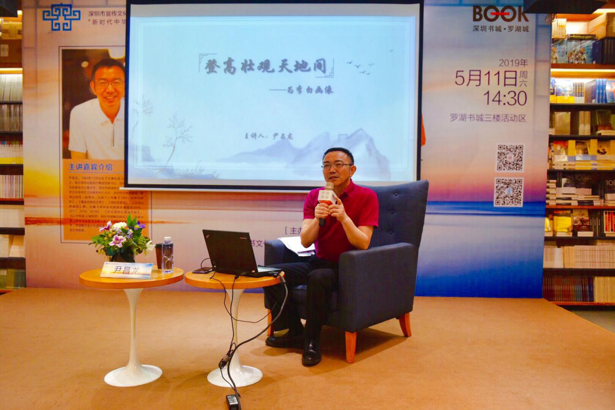 5月11日下午,“新時(shí)代中華優(yōu)秀傳統(tǒng)文化進(jìn)社區(qū)”項(xiàng)目首場(chǎng)講座之“登高壯觀天地間——為李白畫像”在羅湖書城三樓開展。本次活動(dòng)由深圳市壹書文化傳播有限責(zé)任公司、深圳書城羅湖城主辦,特邀深圳出版發(fā)行集團(tuán)黨委書記、總經(jīng)理尹昌龍博士擔(dān)任主講嘉賓,解讀多面詩仙李白,為聽眾奉上一場(chǎng)難得的文學(xué)盛宴。講座還未開始,現(xiàn)場(chǎng)已座無虛席,過道上站滿了李白迷,聽眾們?cè)缭缇蛠盱o候著了。