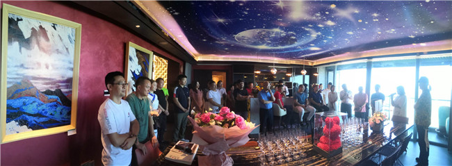 樊鴻賓美術(shù)館座落在珠海市香洲區(qū)內(nèi),旁接情侶路,目眺鳳凰灣,一派浪漫情調(diào),真是一塊滋養(yǎng)藝術(shù)的風(fēng)水寶地。展館所在的天宸大廈十六樓。面朝大海,視野開闊,藍(lán)天白云,碧海揚(yáng)帆,讓人心曠神怡。與此同時(shí),室內(nèi)樂聲輕伴、紅酒飄香,此景、此情映襯之下,緩步巡看展品,或細(xì)細(xì)靜賞佳作,自然而然有一份莫名舒適的藝術(shù)享受。