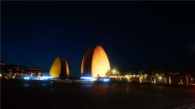 入夜,鳳凰灣地標(biāo)建筑貝殼劇院格外醒目