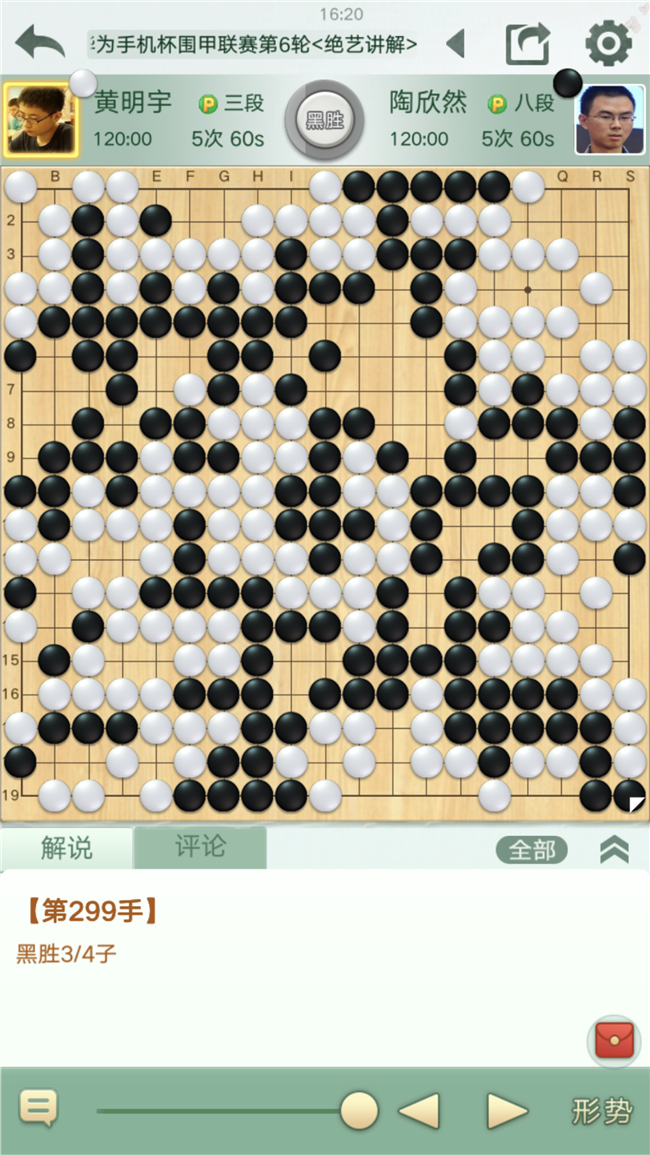 第三臺,陶欣然執(zhí)黑對陣小將黃明宇。局勢幾經(jīng)反復,幸運3/4子獲勝。