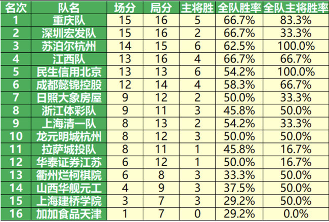 《2020年華為手機杯中國圍甲聯(lián)賽第六輪積分榜》