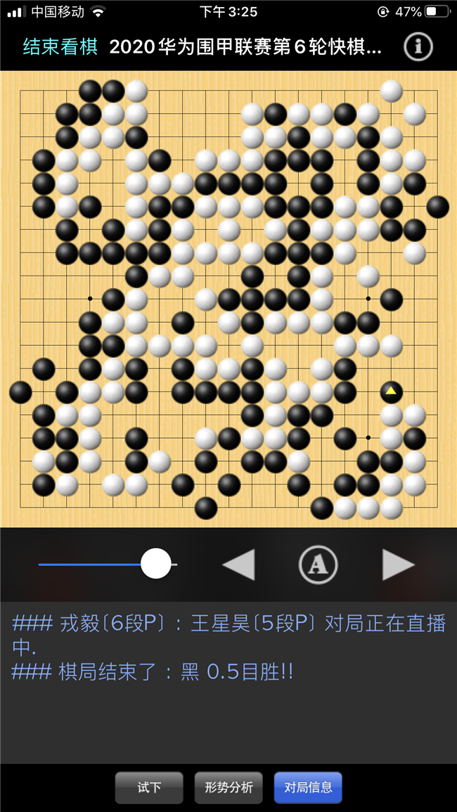誰料做活上面大龍時候失誤導致右邊被白吃掉,結果以幸運的3/4子獲勝。