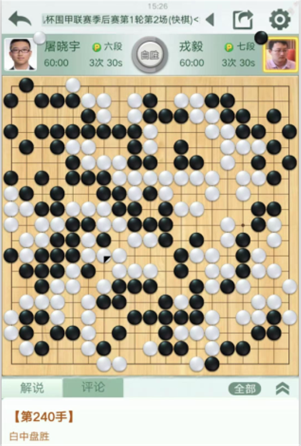 快棋臺由深圳隊戎毅七段執(zhí)黑對陣民生隊的屠曉宇六段。開局黑右上失誤失被白棋先手封住頭,虧損。中盤左邊作戰(zhàn)時候也應(yīng)該中央出頭,實戰(zhàn)貪吃左邊白棋,被白棋外側(cè)滾打包收后劣勢擴(kuò)大。之后黑棋左下隱患沒有及時自補(bǔ),被白棋將左下角吃掉,局面已經(jīng)難以挽回。戎毅中盤負(fù)屠曉宇。