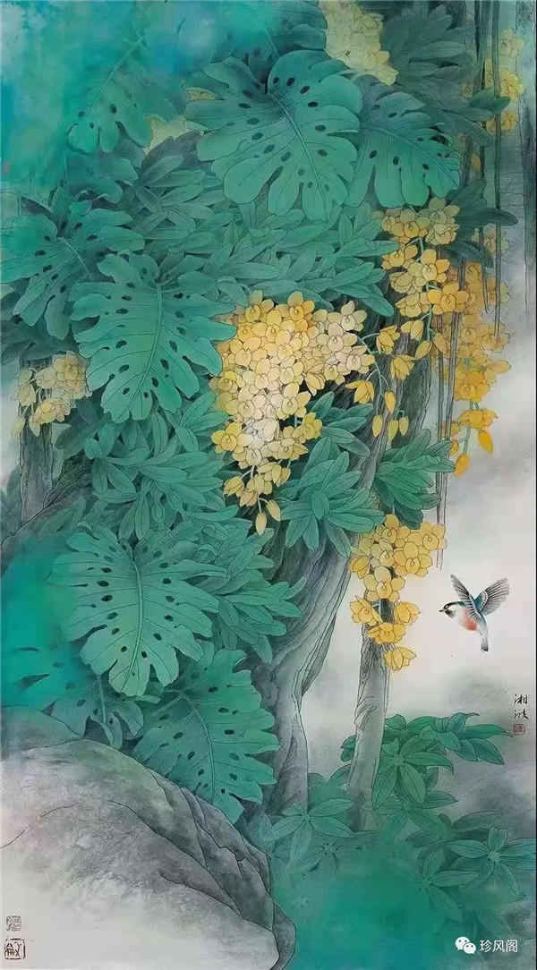 總的來(lái)看,陳湘波先生的工筆花鳥畫,繼承了嶺南畫派重生活、重色彩、重創(chuàng)造的優(yōu)秀傳統(tǒng),創(chuàng)作出來(lái)的是一系列意境深邃幽遠(yuǎn)的作品。他在繼承傳統(tǒng)的基礎(chǔ)上,借鑒現(xiàn)代設(shè)計(jì)、西方繪畫的元素以及其他畫種的繪畫技法,形成了符合現(xiàn)代人審美的具有個(gè)人風(fēng)格的當(dāng)代工筆花鳥作品。