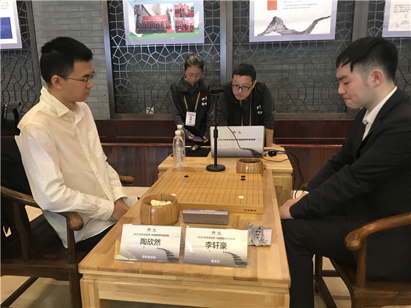 四臺(tái)陶欣然執(zhí)白對(duì)李軒豪一局,甫一開(kāi)始就圍繞“羋氏飛刀”定式引發(fā)的雙征子進(jìn)入纏斗狀態(tài),極其精采,其后,黑棋棄掉左下后在右邊形成巨大模樣。白棋后半盤(pán)局面判斷失誤,手法過(guò)于平淡,沒(méi)有尋求在黑棋模樣中獲得更大便宜的下法。最終白棋以1又3/4子差距落敗。