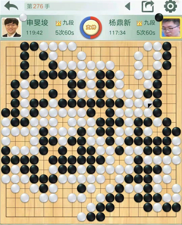 二臺(tái)主將申旻俊執(zhí)白對(duì)陣楊鼎新。右邊戰(zhàn)斗黑棋有所失誤,白棋局面大好。后來(lái)黑棋頑強(qiáng)追趕,最終還是白棋以最小優(yōu)勢(shì)1/4子獲勝。