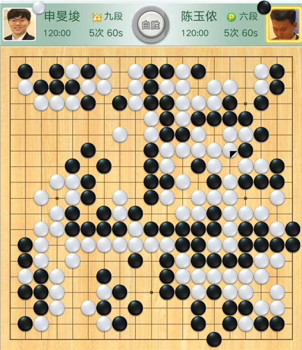 本輪比賽,率先破局取勝的是二臺(tái)外援主將申旻埈。是局,申旻俊執(zhí)白對(duì)陣三連勝的小將陳玉儂。黑棋開局沖擊右下白棋急躁,白棋處理好后局面大幅領(lǐng)先。黑棋之后在左邊與上邊奮力拼搏,白棋冷靜應(yīng)對(duì),輕松獲勝。行棋204手。