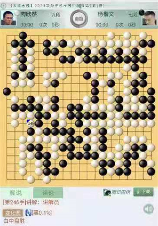 三臺(tái)陶欣然執(zhí)白對(duì)陣等級(jí)分排名29位的楊楷文。開局右邊黑棋沖擊白棋將白分?jǐn)啵怯捎谄逍螞]有下對(duì),反而用來斷開白棋的棋筋被吃,白棋早早進(jìn)入勝勢(shì)。這一盤是此輪深圳龍華隊(duì)唯一勝局,不易!為陶欣然點(diǎn)贊!