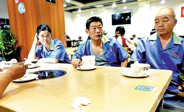 在店里吃飯的人群里,有一張臺(tái)全是清一色的藍(lán)色工作服,特別顯眼?!拔覀兠刻於紩?huì)來(lái)這里吃早餐,差不多有一年時(shí)間了,這里的老板太好了,希望他能一直開(kāi)下去?!边@幾個(gè)大叔、大嬸是周邊物業(yè)的清潔工人,他們每天早上5點(diǎn)鐘就上崗工作,忙完就到了6-7點(diǎn),又餓又累,有一碗熱騰騰的早餐是一件非常幸福的事,而這種開(kāi)心快樂(lè)的事情在這里發(fā)生了。吳姓清潔工說(shuō),這里的老板和員工很好,大家來(lái)這里吃粥,沒(méi)有感到半點(diǎn)不自在,就像在自己家一樣。
