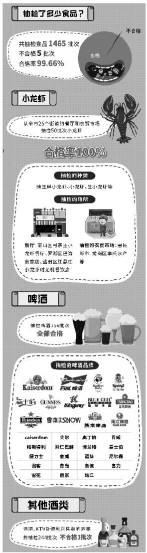 據(jù)了解,在世界杯足球賽開(kāi)賽前夕,深圳市食藥監(jiān)局就通過(guò)網(wǎng)絡(luò)調(diào)查活動(dòng)對(duì)市民票選出的熱門(mén)宵夜食品進(jìn)行了抽檢,包括燒烤類食品、啤酒、小龍蝦、零食炒貨堅(jiān)果制品、膨化食品、醬鹵肉制品,同時(shí)對(duì)備受球迷歡迎的酒吧等場(chǎng)所售賣(mài)的酒類產(chǎn)品進(jìn)行抽檢。行動(dòng)共抽檢樣品1465批次,發(fā)現(xiàn)不合格樣品5批次,合格率達(dá)99.66%。