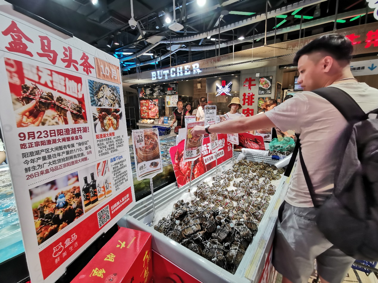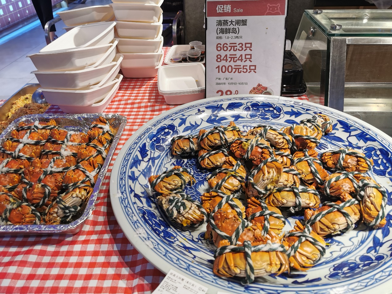 其中爆款非大閘蟹莫屬。民間有個(gè)講究:“九雌十雄”,農(nóng)歷九月吃母的大閘蟹,農(nóng)歷十月吃公的,因?yàn)槟菚r(shí)候大閘蟹的蟹黃和蟹膏是最好的。黃金周期間,盒馬深圳大閘蟹銷(xiāo)量與9月相比增長(zhǎng)六倍。其中最受歡迎的是2兩重的母蟹,盒馬皇庭廣場(chǎng)店假期里試過(guò)一天賣(mài)出近兩千只大閘蟹。