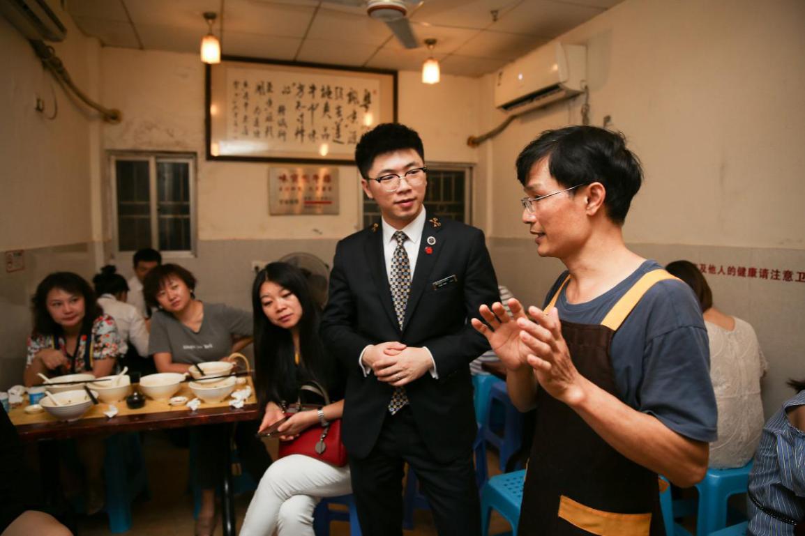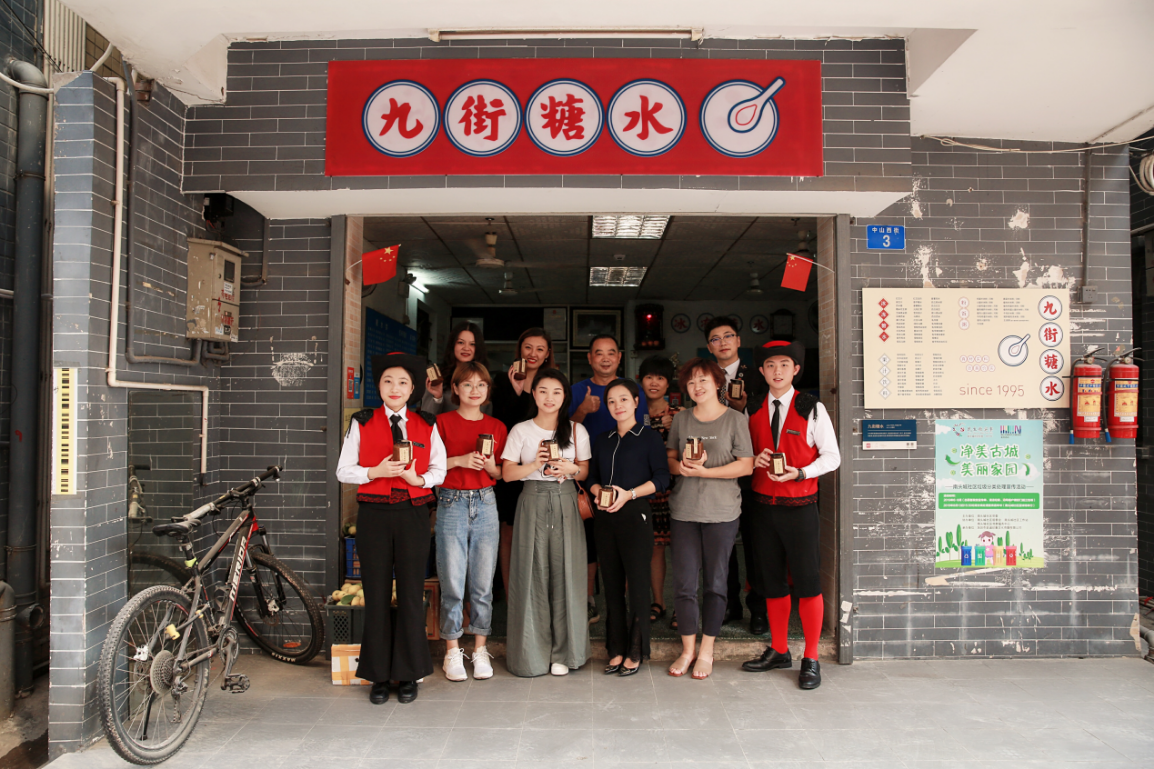 在禮賓司的引領(lǐng)下,大家來(lái)到已有千年歷史的文化遺產(chǎn)——南頭古城。一行人在“九街糖水鋪”入座,店主夫妻倆熱情的端出清甜可口的化州糖水和香氣四溢的潮州炒米粉,和我們嘮起了家長(zhǎng)里短。大家方才得知,這宛如尋常百姓家的糖水鋪竟開(kāi)業(yè)于1995年,見(jiàn)證了古城九街的變遷翻新和故去新來(lái)的幾代人潮川流。帶著傳播化州糖水美名初衷的糖水世家選擇在深圳發(fā)家,傳到這已是第三代。眾人大快朵頤,禮賓司也幫忙跑堂添茶。