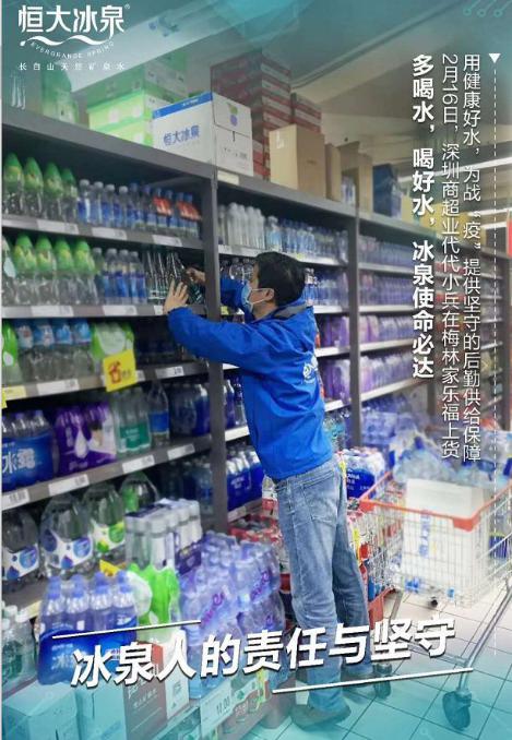 抗擊疫情不停止,恒大冰泉除了捐贈物資提供愛心水,為了確保當?shù)仫嬘盟淖泐~供應,一批批恒大冰泉也在各大商場大量上架。
