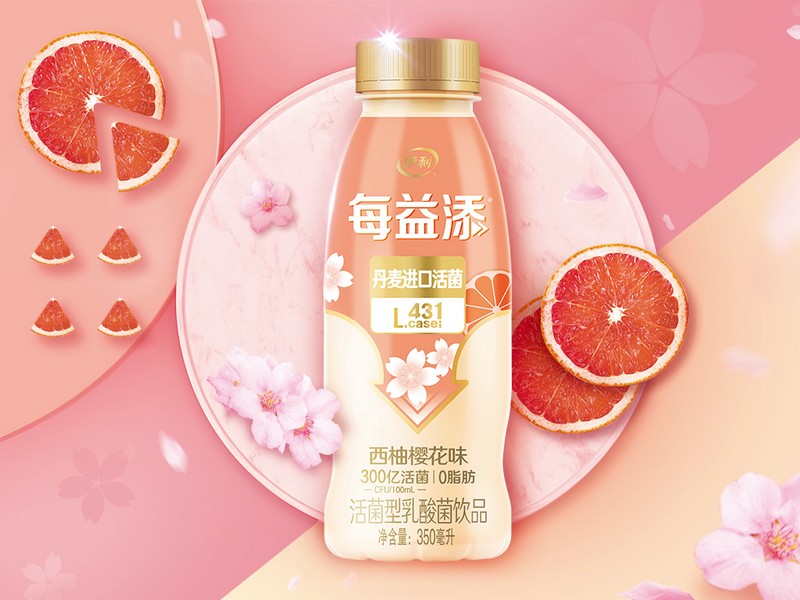 “西柚和櫻花的結(jié)合,花果搭配清新豐富。包裝上,在整體保持每益添品類視覺基調(diào)的一致性的基礎(chǔ)上,添加了花果設(shè)計元素。視覺顏色上傳達了櫻花和西柚的混合特征,櫻花的粉和西柚的橙結(jié)合,元素搭配上采用‘小即是多’的原則,幾朵櫻花一片西柚表現(xiàn)了每益添‘快樂簡單無負擔’的愿景?!庇?8位產(chǎn)品研發(fā)和市場調(diào)研方面的專家組成的評委團,圍繞感官體驗、理念創(chuàng)新、消費者溝通與整體感受等維度,對每益添西柚櫻花創(chuàng)新口味飲品進行了評鑒,并給出這樣的評審語。作為伊利旗下唯一專注低溫活性乳酸菌飲品的品牌,每益添始終堅持助消化的功能打造,其每100毫升富含300億的丹麥進口專屬活菌,從2018年首創(chuàng)百香果創(chuàng)新口味至今,屢創(chuàng)低溫活乳新佳績,引領(lǐng)低溫活乳發(fā)展新潮流。