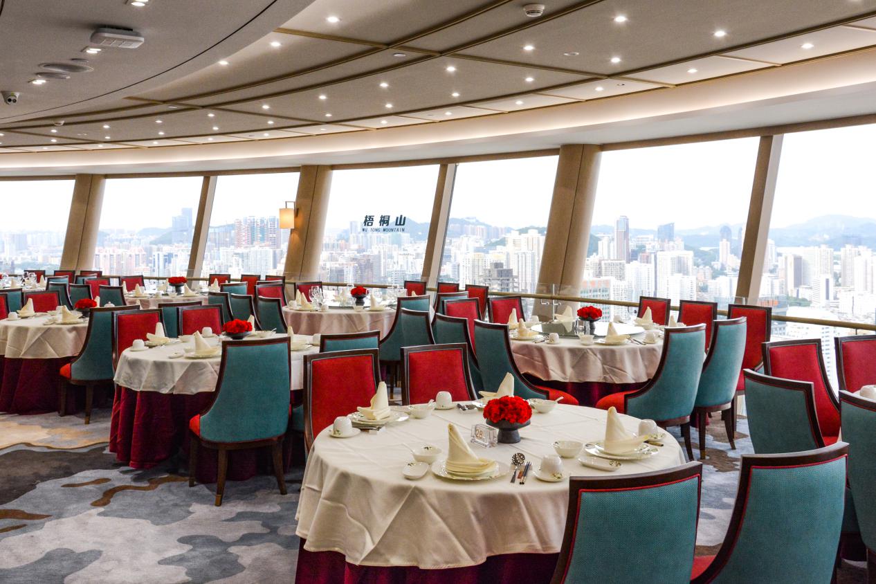 恰逢深圳建市40周年,國(guó)貿(mào)旋轉(zhuǎn)餐廳全面升級(jí),為賓客呈獻(xiàn)以“春天的故事”為主題的現(xiàn)代化新中式裝潢,精心營(yíng)造舒適高端的環(huán)境。重新裝修后的旋轉(zhuǎn)餐廳,不僅升級(jí)了專屬觀光電梯,還在42層布置了“改革開放展廳”供賓客參觀。