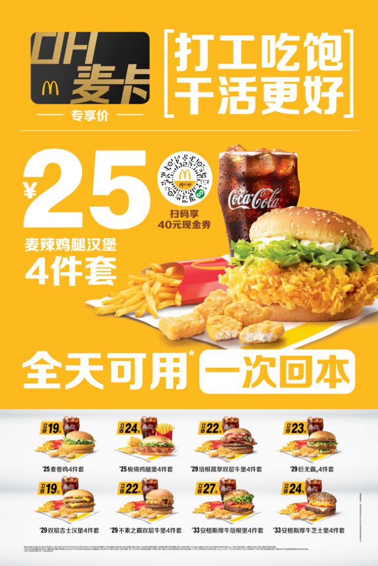 調(diào)研還顯示,超過(guò)四成的消費(fèi)者表示希望在餐飲上節(jié)約至少10%的支出,而麥當(dāng)勞的“打工人保底計(jì)劃”提供了多種大力度的優(yōu)惠。以午餐為例,消費(fèi)者若購(gòu)買(mǎi)OH麥卡,享用超值四件套即可至少節(jié)省19元,即減少39%的開(kāi)支。