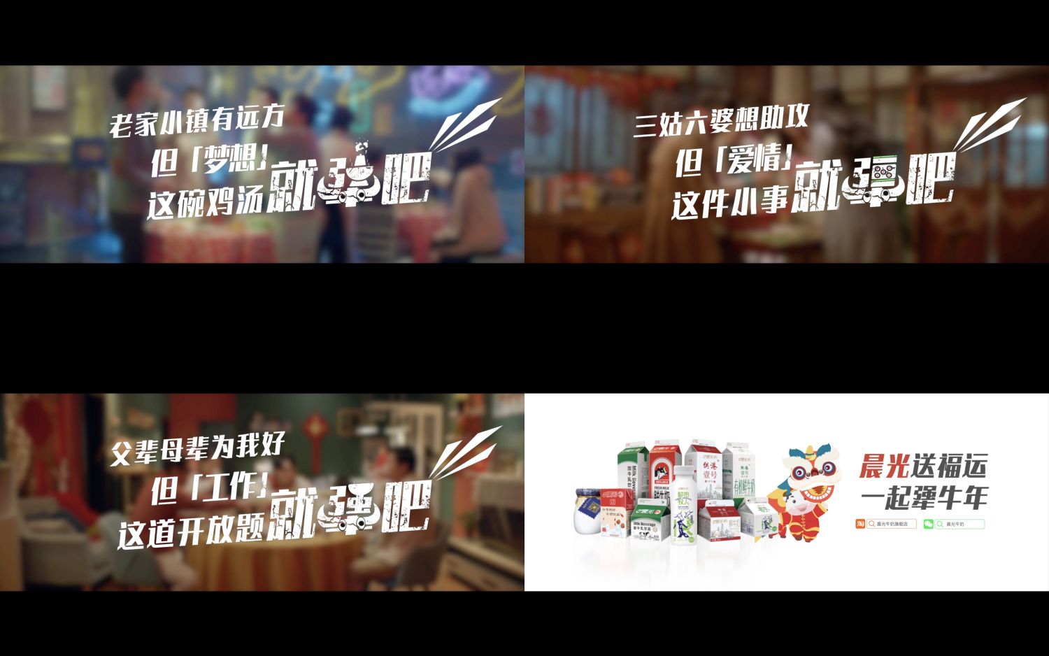 1月29日,晨光乳業(yè)《就犟吧》賀歲TVC微信、朋友圈正式上線,就春節(jié)熱門話題“結(jié)婚、找穩(wěn)定工作、要不要外出追夢(mèng)”進(jìn)行了生動(dòng)演繹。在熱鬧喜慶的年節(jié)氛圍中,趣味反轉(zhuǎn)的劇情,形象展現(xiàn)了新一代年輕人對(duì)于工作、愛(ài)情、夢(mèng)想“不服輸、敢堅(jiān)持”的態(tài)度。